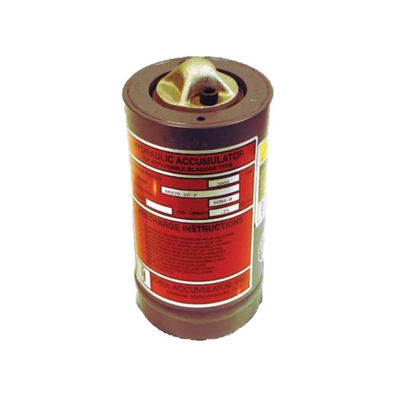 Utilized am upper cap and threaded ring assembly to retain and seal the open topped bladder, providing a simple “top-repairable” advantage; e.g., unit does not have to be removed from vertically mounted application in order to replace bladder as long as Accumulator can be isolated from system pressure and physically accessible.